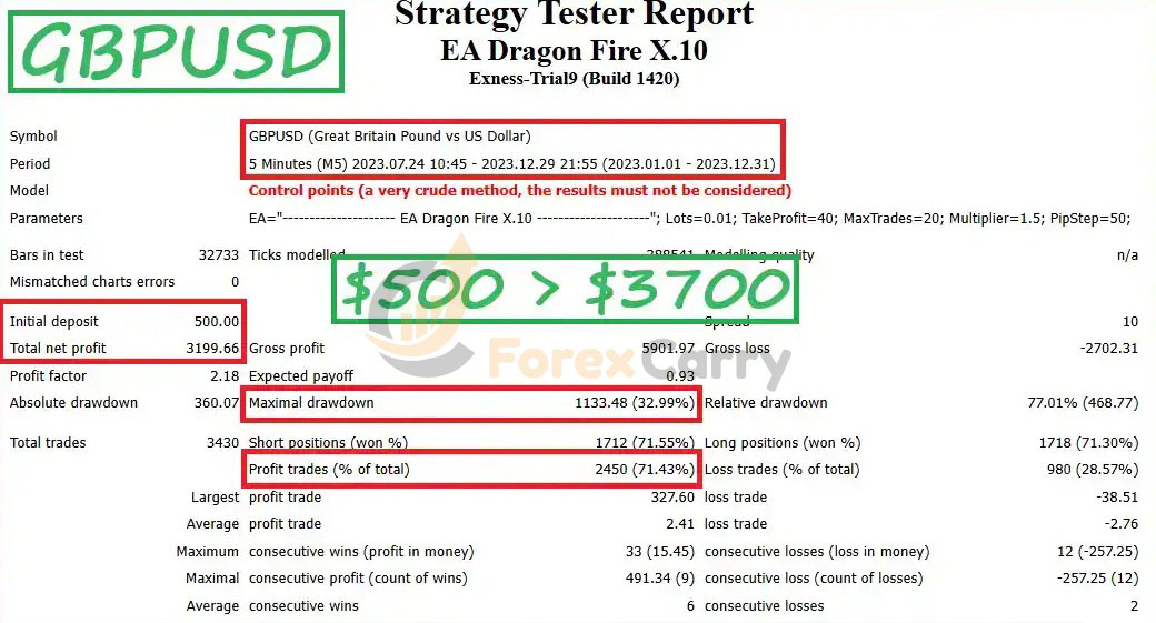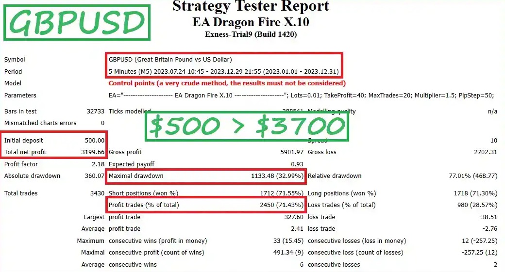 The backtesting outcomes for the EA Dragon Fire X.10 trading algorithm are encouraging. In tests with EURUSD at a $100 capital, profits reached $4400. GBPUSD tests with a $500 capital resulted in $3700 in gains. The highest capital drawdown was safely kept between 30% and 52%. These findings indicate a strong potential for profit generation with modest investment.